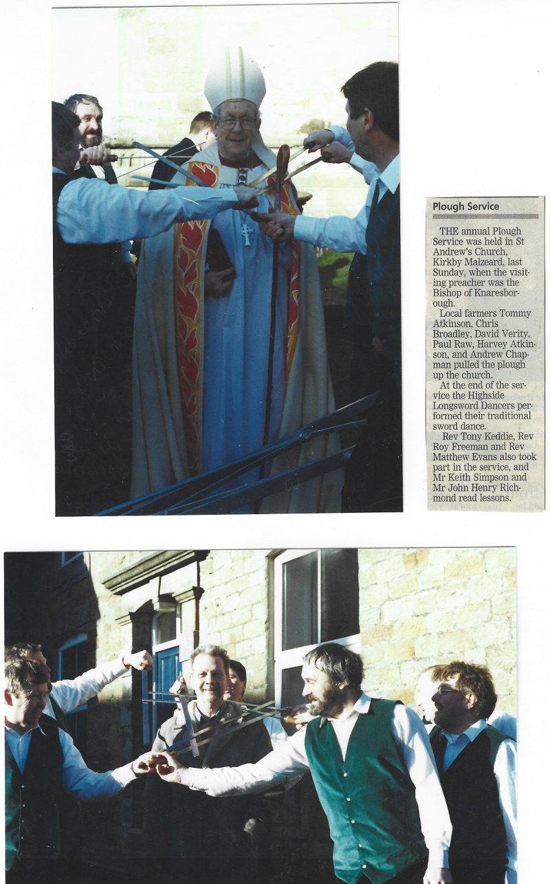 Plough Blessing at Saint Andrews's Church in Kirkby Malzeard is the highlight of our year. We followed the plough down the aisle as usual but this year we sat in the left hand choir stalls. I think this was because the sun was very low and it was quite difficult to see! There was quite a collection of clergy at the service this year including the Bishop of Knaresborough who gave the address. The new Deacon was also there, he looks like a Doctor Who in his ordinary clothes. We danced very well, Ray was a touch nervous towards the end.