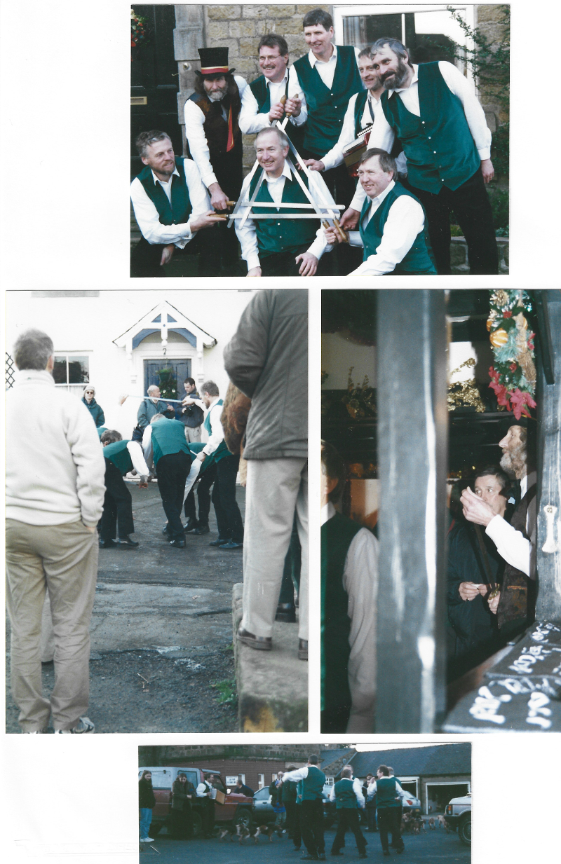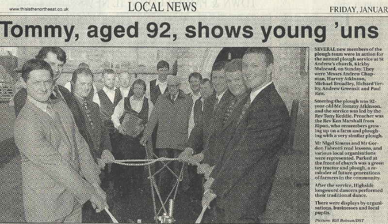 Bill Robson took our photographs together with the plough lads outside the church. One was printed in the Darlington & Stockton Times and one, the following week, in the Ripon Gazette. The D & S picture was seen by Mr Norman R Wood from Skeeby near Richmond. He danced in the team that his father Ralph started in the 1920's and 30's. After dancing, we went to Ray's house for food and drink and a very enjoyable afternoon.