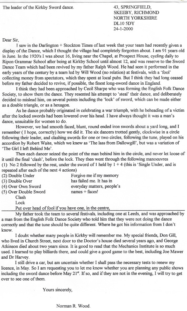 After out last dance out, our picture appeared in the Darlington & Stockton Times where it was seen by Norman R Wood. Norman danced in the Kirkby team in 1925 and his father Ralph was instrumental in starting the team of that era. Norman now lives in Skeeby near Richmond. He was born in 1909.