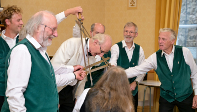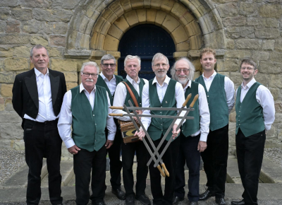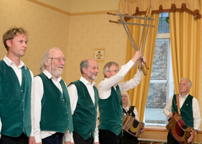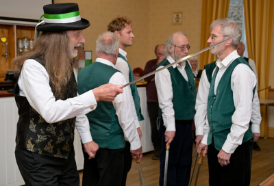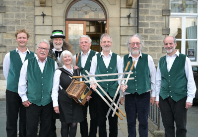 Ripon City Morris Dancers had been involved in the filming of a documentary about the restoration of an old Victorian shop in Masham called Peacock and Verity's. The first episode was transmitted on Channel 4 and a special screening as held in Masham Town Hall where the 'stars' were in attendance. We were asked by Emily, the producer, to perform before the start and 'behead' the main 'star', Ian Johnson, a well known character in Masham. We had a good audience and the dance went very well, if a little slow. Beheading Ian turned out to be a bit tricky as he is very tall! It was a very enjoyable evening, the show being very entertaining. There is a write up, with pictures, in the following week's Darlington and Stockton Times. Thanks to Andrew Burns for the photo.